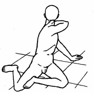 2. Положение Примите прежнее положение, сидя на полу. Ноги согнуты в коленях, которые опущены влево. Подошва левой стопы прилежит к правому бедру, и вы без усилия опираетесь на разогнутую левую руку. Теперь положите правую руку на темя. При этом слегка сжимайте голову этой рукой. Полностью расслабьте шею. Движение, таким образом, выполняется только правой рукой.