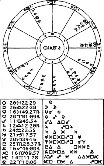 Когда мы добрались домой, то построили карту на это время, используя координаты Вашингтона, округ Колумбия. Карта 8 — это карта вопроса Кэрол: “Что случилось с моим кошельком?”. Меркурий управляет Асцендентом, так что он управляет и Кэрол. Знак и аспекты Меркурия описывают то, что Кэрол ощутила в связи с этой ситуацией. Меркурий ретрограден и находится в знаке Рыб, управляющем смятением и унынием. Он в оппозиции к Асценденту, что указывает на подозрения в отношении попутчика. Это подтверждается соединением Меркурия и Солнца, управителя двенадцатого дома Кэрол. Теперь давайте рассматривать второй дом, — его управитель укажет нам, что уже случилось и что еще случится. Вторым домом управляет планета Венера в знаке Овна, расположенная в восьмом доме и ретроградная. Как я уже сказал, управитель второго дома ретрограден, так что есть возможность получить кошелек обратно, но кое-что из его содержимого будет отсутствовать. Две планеты находится во втором доме - Луна “без курса” и ретроградный Юпитер. Это говорит нам, что возможность получить деньги, которые были в кошельке, ничтожна. Юпитер показывает, что в кошельке была порядочная сумма денег, но все же не сбережения всей нашей жизни. Что касается пяти сигнификаторов, то только Марс угловой. Марсу мы присваиваем вес 2 балла, используя нашу шкалу оценки сигнификаторов. Он получает эти 2 балла, потому что он диспозитор Колеса Фортуны. В этой карте наибольший вес имеют дома следующие. Был ли похищен бумажник? Взял ли его кто-то? Да, управитель второго дома делает почти точный квадрат (сходящийся) с Нептуном, управителем воровства (седьмого дома). Обратите внимание, что две планеты находятся в седьмом доме воровства, — это Солнце и ретроградный Меркурий. Марс, управитель восьмого дома, представляет похищенные деньги и делает сходящийся трин с Солнцем в доме воровства. Это может указывать на то, что к этому были причастны два человека; в этом случае Меркурием управляется молодой человек (человек любого пола, так как Меркурий двуполый), а человек средних лет описывается Солнцем. Будет ли бумажник найден и возвращен? Да, управитель бумажника Венера образует сходящийся секстиль с Сатурном, управителем завершения дела (пято-го дома), а также соединение с Колесом Фортуны. Венера также делает сходящиеся квадраты с Нептуном и Ураном, стоящими в пятом доме. Это указывает на необычный или непредсказуемый и разочаровывающий результат. Как и во всех хорарных картах, четвертый дом от любого другого дома покажет, чем завершится начатое дело. Мы прибыли домой в штат Коннектикут около 7:30 пополудни, а в 8:05 пополудни позвонили сотруднику службы безопасности Аэропорта Даллеса. По его словам, бизнесмен (тот, который проходил перед нами) взял свой чемодан с вещами с ленты конвейера, и, так или иначе, бумажник Кэрол случайно оказался среди вешалок для одежды в его багаже. Когда он заметил кошелек, выглядывающий из его багажа, он принес его обратно к стойке службы безопасности. По словам охранника, все было на месте, включая деньги. 0н сказал, что теперь должен будет сообщить о найденном кошельке и передать его другому работнику, который запакует и отправит его в камеру хранения авиакомпании в Хардфорде. Он также сказал, что не может гарантировать, что все будет в целости, когда мы получим бумажник, и что Объединенны