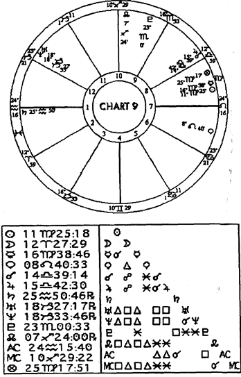 направлении, а также продолжить линию в противоположном направлении и искать на юго-юго-западе. Обследуя всю эту диагональ, мы всегда находили Тамбелину. В карте примера 9 “Где Тамбкин?” наше домашнее животное управляется шестым домом и, следовательно, Луной. В локально-пространственной карте, приведенной выше, Луна показывает, что Тамбелина находится в северо-ссверо-восточном направлении от точки Х в середине пола нашего дома. Чтобы работать по этому методу, на самом деле необязательно рисовать локально-пространственную карту. Помните, анти-вертекс — это истинное восточное направление, так что можно брать обычную хорарную карту и отмечать анти-вертекс, который и укажет на восток. Теперь отметьте направление,на которое указывает управитель второго дома, если вы ищете потерянную собственность, или управитель шестого дома — для поисков домашнего животного, или управитель 12-го дома, если вы потеряли слона! Я также использую эту методику для других целей в моей хорарной практике. Они работает очень хорошо, если нужно получить направление по сторонам света и порекомендовать банк для получения ссуды (8-й дом), направление для выбора квартиры для жилья (4-й дом), места, где стоит искать работу (10-й дом). Вы можете размещать людей, вещи или места, используя этот метод. Я беру точное время для хорарной карты. Если кто-то задает вопрос: “Где мне найти приличный автомобиль?”, я строю карту и беру управителя третьего дома, чтобы найти нужное направление. Затем я беру управителя третьего дома и вычитаю его градус из градуса управителя Асцендента (я вычитаю меньшее из большего). Допустим, разница составляет 5 градусов. Это показывает, что искать автомобиль следует в направлении управителя третьего дома на расстоянии 5, 50 или 500 сотен миль. Помните, что расстояние будет кратно пяти. Это может означать также 5 дюймов, 5 футов, 5 ярдов или 5 акров. Возвращаясь к использованию локально-пространственных карт для установления местонахождения потерянных вещей, я нахожу, что склонение управителя второго дома дает позицию объекта по вертикали. Вели широта имеет отрицательное значение, или ниже горизонта (южная широта — примеч. пер.), то объект находится близко к полу или в подвале. Если широта имеет значение выше горизонта (северная широта — примеч. пер.), то и объект находится выше. Чем больше склонение, тем выше объект будет находиться. Если склонение более 10 градусов, это означает, что объект может быть на втором этаже дома. В июне 1993 года улица, на которой мы живем, подверглась жуткому воздействию. В день новолуния группа S.W.А.Т. вторглась в нашу нормальную, спокойную жизнь с автоматами и собаками, обыскивая каждый дом в поисках человека, который только что затеял перестрелку с полицией. Он был ранен (не смертельно) в гараже, стоящем вдоль улицы, ведущей к нашему дому. Два следующих вечера у нас стояла вооруженная бронетехника, нацеленная на два дома на нашей улице. В течение недели были разные происшествия, санитарные машины и большое количество полицейских машин, сирен и мигалок, призванных на помощь пострадавшим от огня, ожесточенной борьбы и сердечных приступов при вторжении на нашу улицу. Я мог бы проигнорировать одиночный инцидент, но все случившееся в течение нескольких дней возбудило мой интерес. Будучи астрологом, я задался вопросом, что могло бы п