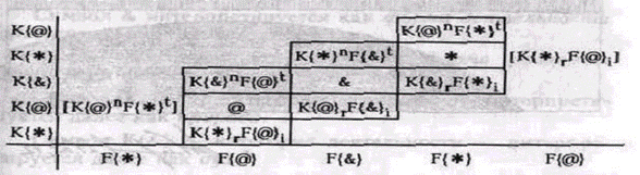 Здесь в левом столбце обозначены категории, а в нижней строке – формации. Для удобства составные формы K{*}rF{@}i и K{@}nF{*}t показаны на проекции дважды, хотя это пары проекций одной и той же "клетки-ячейки" "таблицы" форм ("вторые" экземпляры этих форм в таблице заключены в квадратные скобки). Благодаря этому каждый из трех простых символов оказался в окружении четырех составных. Из данной таблицы легко видеть, что все формы, обозначенные символами с верхними индексами (в интерпретации – "номинальные" и "трансцендентные") располагаются соответственно левее и выше диагональных (чистых) форм, а все формы, обозначенные символами с нижними индексами (в интерпретации – "реальные" и "имманентные") располагаются соответственно правее и ниже диагональных (чистых) форм. Date: 2015-06-07; view: 602; Нарушение авторских прав |