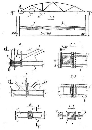 Рис. 10.47. Усиление нижнего пояса стропильной фермы затяжками из швеллеров: 1 — усиливаемая ферма; 2 —Соковые предварительно напряженные затяжки: 3 — торцевой упор; 4 — пазуха, заполняемая бетоном; б — вертикальный держатель по торцам ферм; 6 — то же, в середине пролета; 7 — хомут из листовой стали; 8 — распорный винт упора; 9 — квадратный элемент с нарезкой для винта