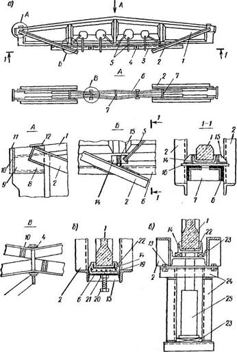 Рис. 10.50. Усиление стропильной балки предварительно напряженным шпренгелем из уголков: а — общий вид усиления; б — предварительное напряжение шпренгеля с помощью натяжного винта; в — то же, с помощью домкрата; 1— усиливаемый элемент; 2 — наклонный тяж; 3 — уголок нижнего пояса; 4 — компенсирующие накладки; 5 — монтажные подвески: 6 — горизонтальный тяж шпренгеля: 7 — распорная планка; 8 — боковой лист анкерной коробки; 9 — прижимное ребро анкерной коробки; 10 — сварной шов; 11 — упорный торцевой лист; 12 — соединительная планка; 13 — соединительные болты; 14 — упор из отрезка швеллера; 15 — ребро жесткости; 16 — круглый коротыш упора; 17 — гайка; 18 — стяжной болт; 19 — сварная сетка; 20—натяжной винт-упор; 21 — квадратный элемент с нарезкой; 22 — пементно-песчаный раствор: 23 — накладки-упоры; 22 — подвесная конструкция для установки домкрата; 25 — домкрат (гидравлический)