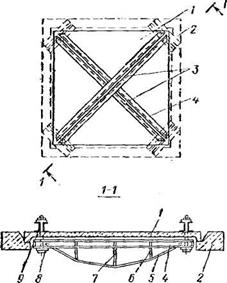 Рис. 10.54. Усиление сборной плиты, опертой по контуру, пространственным шпренгелем: 1 — усиливаемая плита; 2 — элемент несущего контура; 3 — пространственные шпренгель; 4 — верхний пояс; 5—нижний пояс; 6 — промежуточные стойки; 7 — центральная стоика; в —болты для подвески шпренгеля. 9 — передаточные траверсы