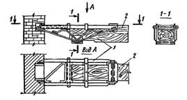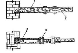Для установки прутковых протезов под дефектные балки подводят временные опоры, разбирают деревянное перекрытие по ширине на 75 см снизу и на 1,5 м сверху от стены, спиливают поврежденный участок балки по длине примерно на 0,5 м, заводят протез в опорную нишу и скрепляют его с балкой гвоздями (рис. 119). Рис. 11.8. Усиление опорной части балки перекрытия: