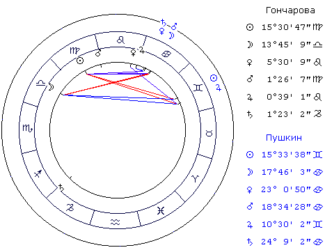 При определении совместимости между партнерами в подавляющем большинстве случаев достаточно космограммы, т.е. достаточно нарисовать синастрическую карту на основе космограмм двух людей и нет нужды подниматься на уровень индивидуальных гороскопов, рассчитанных с учетом времени и географических данных рождения. Это, конечно, удобно, поскольку нас перестает волновать такая сложная проблема астрологии вообще, как ректификация натальной карты. Это большой плюс синастрической астрологии. Вышеназванные обстоятельства дают еще одно преимущество: мы можем уверенно использовать в качестве учебных примеров синастрические карты известных исторических личностей, индивидуальные гороскопы которых неизвестны. Нам достаточно иметь только дату рождения. Давайте рассмотрим пару А.С.Пушкин и Наталья Гончарова. Перипетии их отношений нам всем ведомы со школьной скамьи, тем более интересно увидеть, как это работает на уровне планет. Сначала небольшое замечание: тогда еще не был открыт Плутон, т.е. он не работал в индивидуальных картах, поэтому мы его должны из рассмотрения исключить. Итак, Пушкин родился 6 июня 1799 года (это уже по новому стилю), давайте возьмем полдень по современному московскому времени. Н. Гончарова родилась 8 сентября 1812 года (новый стиль), тоже возьмем полдень. Посмотрим карту на рис. 12