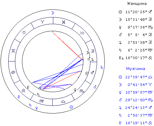 Рис. 15 Это как раз пример брака представителей различных культур, как национальных, так и религиозных. Здесь немножко нарушено "правило совместного проживания", они живут в Петербурге, но все же они живут в другом городе относительно как его, так и её родителей и родственников. Кстати, брак, когда жена мусульманка, а муж христианин, более устойчив, у мусульман принято уважительно относиться к мужчине, вот если наоборот (жена - христианка, а муж - мусульманин), тогда и возникают проблемы. Христианки начинают требовать равноправия и моногамных отношений... Сексуальное взаимодействие. Солнце(Ж) в квадратуре с Венерой(М), Марс(Ж) в квадратуре с Луной(М), Марс(Ж) в трине с Венерой(М). Страсть, очень пылкое влечение, но и устойчивое по одному из аспектов. Часто у супругов только один сексуальный аспект встречается, и то они находятся в связи по много лет, а тут сразу три, да еще разные по качеству. Очень богатая и разнообразная сексуальная жизнь. Внешняя совместимость. Луна(Ж) и Венера(Ж) не аспектированы Солнцем(М) и Марсом(М). Ну, и ладно, обойдемся. Психологическая совместимость. Луна(Ж) в трине с Венерой(М), есть симпатия. Конфликтные планеты. Из конфликтных взаимодействий присутствуют два аспекта, Плутон(М) и Плутон(Ж), Сатурн(М) и Сатурн(Ж). Только два аспекта, да и то в них участвуют невозбужденные планеты либо мужа, либо жены. Вывод астролога: конфликты есть, но они не оказывают разрушительного влияния на партнерство, конфликты разрешимы. Юпитер(Ж) не создает гармоничных аспектов к Солнцу(М) или Луне(М). Сатурн(Ж) не создает повреждающих аспектов к Солнцу(М) или Луне(М). То же самое можно сказать о Сатурне(М) и Юпитере(М). У данных партнеров нет печати счастья, но и нет печати несчастья. Резюме: очень хорошая сексуальная совместимость, неплохая психологическая совместимость и приемлемый уровень конфликтности. Это нормальный брак, который является устойчивым в течении многих лет. Так и есть, эта пара уже отпраздновала серебряную свадьбу. Но тут я должен вам сказать следующее. Чтобы достоверно сделать вывод "данный брак на всю жизнь", мы должны обязательно посмотреть радиксы партнеров. Дело в том, что разводы могут происходить не только из-за конфликтов между партнерами, но и по другим причинам. Например, муж был осужден на длительный срок заключения, тогда супруги по закону автоматически считаются в разводе, хотя конфликта на личном уровне у них не возникло. Т.е. а) если в локальной карте нет формулы развода и б) у партнеров хорошая совместимость, тогда можно делать вывод: "данный брак устойчив, и продлится всю жизнь". Что значит "формула развода"? Это три (или более) негативных аспекта между элементами VII дома и показателем первого брака (если вы рассматриваете ситуацию именно первого брака) с одной стороны, и элементами XI дома и Ураном с другой стороны. Пример: у человека в локальной карте Венера показатель первого брака, Солнце - управитель VII дома и Марс стоит в VII доме. При этом управитель XI дома в квадратуре к Солнцу, соуправитель XI дома в оппозиции к Марсу, а Уран в квадратуре с Венерой. Вот вам формула разрыва партнерских отношений. Если в эту формулу "встраиваются" негативные аспекты от элементов X дома, то разрыв фиксируется документально в органах ЗАГС. Когда будет разрыв, покажут прогрессии. При повторении формулы развода в прогрессиях, это событие про