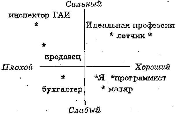 Рис. 4 Двумерное семантическое пространство в результате шкалирования профессий по «семантическому дифференциалу» На приведенном примере самыми близкими к идеальной из всех рассматриваемых профессий для испытуемого оказываются профессии «летчика» и «инспектора ГАИ». После того остается выяснить, Основы психодиагностики имеются ли у испытуемого реальные профессионально важные качества для того, чтобы претендовать на овладение этими профессиями. Специально отметим, что СД используется и для диагностики самооценки. Достаточно попросить ребенка оценить самого себя по тому же самому набору шкал. В результате в семантическом пространстве появляется точка «Я». Степень удалении этой точки от «идеальной» — мера недовольства собой. Например, на рис.4 мы видим, что ребенок считает себя в целом «хорошим», но несколько «слабым» и оказывается ближе всех не к «летчику» и «инспектору ГАИ», а к «маляру». Подчеркнем еще раз, что для успешного использования СД материал, который шкалирует ребенок, должен соответствовать по возрасту его кругу интересов, иначе ребенок просто наставит в бланке более или менее случайный узор отметок. С младшими школьниками и дошкольниками СД лучше проводить в индивидуальной и устной форме, то есть все отметки на бланк должен заносить сам экспериментатор — по устным ответам ребенка. В качестве материала (объектов для оценки) лучше использовать сказочных персонажей или героев мультфильмов. Специальные исследования В. Ф. Петренко показали высокую эффективность этого материала в работе с детьми. Особая модификация СД допускает, чтобы сказочные персонажи обозначали не объекты, а полюса шкал. В этом случае родители, друзья и учителя будут сравниваться ребенком с определенными сказочными персонажами. Специфические проблемы и трудности семейной идентификации или школьной адаптации могут проявиться в СД как в любой проективной методике. Например, нелюбимая старшая сестра может оказаться близкой в семантическом пространстве к «Бабе Психодиагностика как научная технология Яге», а завуч, которого ребенок просто боится, — к какому-нибудь «роботу-киллеру». * ■» Date: 2015-06-07; view: 512; Нарушение авторских прав |