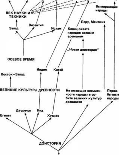 безжизненности. Лишь словесные данные позволяют нам ощутить человека, его внутренний мир, настроение, импульсы. Письменные источники нигде не датируются ранее 3000 г. до н. э. Следовательно, история длится около 5000 лет. Объективно доистория - поток различных изменений, однако в духовном смысле это еще не история, поскольку история возникает лишь там, где есть осознание истории, традиция, документация, осмысление своих корней и происходящих событий. Представление, что и там, где нет преемственности традиций, история, как таковая, все-таки была или даже должна была быть, не более чем предрассудок. История - всегда ясное для человека прошлое, сфера усвоения этого прошлого, сознание своего происхождения. Доистория - обоснованное, правда, фактически, но не познанное прошлое. Развитие человека в доисторическую эпоху - это становление основных конститутивных свойств человеческого бытия; развитие человека в историческую эпоху — это развертывание ранее обретенного содержания духовного и технического характера. Конститутивные свойства человеческого бытия складывались в неизмеримых пластах времени; напротив, историческое развитие выступает как ограниченное во времени явление, выразившее себя в творениях, представлениях, мыслях, образах на широкой и глубокой основе сложившегося в доистории и по сей день еще действенного человеческого бытия. Доистория и история создали, таким образом, в своей последовательности две основы нашего существования. Доисторическое становление человека — формирование человека как вида со всеми его привычными склонностями и свойствами, со всей присущей ему сферой бессознательного — составляет фундамент нашего человеческого бытия. Исторически осознанная передача свойств человека и его эволюция, которая показывает нам, на что был способен человек, и которая всем своим содержанием составляет источник нашего воспитания, нашей веры, нашего знания и умения,— этот второй момент в развитии человека — подобен тонкой оболочке над кратером вулкана. Может случиться, что эта оболочка будет сброшена, тогда как фундаментальные свойства человека как представителя данного вида, сложившегося в доисторические времена, неотвратимо присущи его природе. Быть может, нам грозит опасность вновь превратиться в людей каменного века, ибо мы, собственно говоря, никогда не перестаем ими быть. Тогда мы, располагая уже не каменным топором, а самолетами, по существу, вернулись бы к доисторическим временам, а тысячелетия истории были бы забыты, и следы их стерты в памяти. Конец истории мог бы вернуть человека к тому состоянию, в котором он, будучи уже и все еще человеком, существовал много тысячелетий тому назад: без знания и сознания того, что от поколения к поколению передавался накопленный опыт. Мы ничего не знаем о душе человека, который жил 20 000 лет тому назад. Однако мы знаем, что на протяжении известной нам истории человечества, этого короткого промежутка времени, человек не изменился существенным образом ни по своим биологическим и психофизическим свойствам, ни по своим первичным неосознанным импульсам (ведь с тех пор прошло лишь около ста поколений). Результатом доисторического становления является то, что наследуется биологически, что, следовательно, способно устоять во всех катастрофах истории. Исторические же приобре
