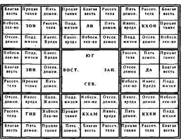 Таблица 16. Геомантическая диаграмма. Возникающее в результате такой методики распределение по направлениям представляют на геомантической диаграмме (табл.16). Чтобы воспользоваться ею, нужно определить индивидуальное Парка и найти его на диаграмме. Восемь клеток, окружающие его, показывают, какому виду взаимосвязи соответствует каждая из восьми сторон света (для данного человека в данном году). В тибетском альманахе на каждый вид взаимосвязи даются соответствующие рекомендации. Если элементы повреждены, то рекомендуется делать То (gto). To - это общее название магической церемонии для предотвращения несчастий. Смысл восьми видов взаимосвязи следующий: 1. «Рассечение тела» (lus chad) - букв, наказание, расчленение тела. Может быть повреждена определенная часть тела, соответствующая индивидуальному парка, а также Ла человека. Согласно Пунцогу, Парка Ли соответствует голова, Кхон левая рука, Да - левые ребра, Кхен - левая нога, Кхам - мужской член, Гин - правая нога, Зин - правые ребра, Зон - правая рука. Альманах рекомендует делать ритуал выкупа Ла. 2. «Небесное лекарство» (gnam sman) - букв, небесное (божественное) лекарство. Благоприятно для лечения болезней и медицинских процедур. Альманах рекомендует заготовлять лекарственное сырье в соответствующем направлении. 3. «Пять демонов» (srog 'tsho ‘dre lnga) - букв, пять злых духов. Возможны зловредные воздействия. Рекомендуется помещать в этом направлении диаграмму выкупа, символизирующую человека и его имущество, чтобы обмануть демонов. 4. «Отсекающий демон» (bdud gcod) - букв, демон, отсекающий (жизнь). Угроза жизни, поскольку в данном случае имеются в виду демоны, крадущие жизненную силу. В этом направлении рекомендуется положить Пурбу. Альманах рекомендует бросать в этом 5. «Процветание» (dpal bskyed) - букв, увеличение счастья, благосостояния. Благоприятно для удачи. Альманах рекомендует выполнять ритуал славы и богатства (g.yang) 6. «Нанесение вреда» (gdon pa) - букв, нанесение вреда, насылание болезни, препятствий, ущерба. Альманах рекомендует делать ритуал отбрасывания негативностей Догпа (bzlog pa). 7. «Поддержка жизни» ('dre lang srog 'tsho) - букв, поддержка, продление жизни. Хороша для Сог, альманах рекомендует спать головой в этом направлении. 8. «Благая весть» (phya lon) - букв, послание (счастливой) судьбы. Хороший знак для путешествия. Альманах указывает, что с этого направления может прийти благой совет, наставление. Все эти рекомендации относятся именно к тому направлению, которым они управляют. В частности, когда речь идет о необходимости выполнять ритуалы, с одной стороны это может означать, что, если данный ритуал содержит какие-либо действия, которые связаны со сторонами света, их нужно выполнять именно в данном направлении. С другой стороны, вероятно, весь ритуал в целом полезно выполнять в тех случаях, когда возникают те или иные проблемы или враждебные воздействия, каким-либо образом связанные с данным направлением. Аналогичные принципы интерпретации можно использовать и в других случаях, причем трактовки могут приобретать значительную глубину. По существу последовательное примене- ние этой оригинальной геомантической методики может означать, проецирование всего измерения человека на мандалу сторон света, когда все аспекты его жизни и деятельности ставятся в соответствие с конкретными направлениями.