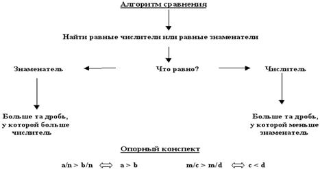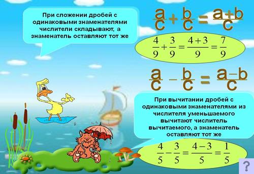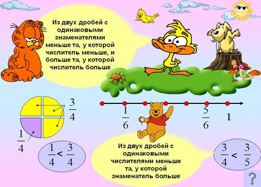 I. Организационный момент. Начинается урок. В путешествие пойдем, В страну сказки попадем. Слушай, думай, наблюдай, Анализируй и считай. Будем мы решать, трудиться, Нам, друзья, нельзя лениться. Сегодня мы проведем урок-путешествие с одним из героев вашего любимого автора – Виталия Бианки – Муравьишкой. Вместе с ним мы узнаем, как называется каждое число, используемое при записи дробей, закрепим умения решать задачи, уравнения. II. Актуализация знаний. - Начнем урок, как обычно, с устного счета. - Где живут муравьи? (В муравейнике). - В одном муравейнике муравьев столько, сколько людей в большом городе. Количество особей в муравейнике среднего размера достигает 100-200 тысяч. 1) Решение задач в стихотворной форме. а) Задача на нахождение суммы трех слагаемых удобным способом: Дружно муравьи живут И без дела не снуют. 27 несут травинки, 35 несут былинки, 23 несут иголки. Сколько их всего под елкой? б) Задача на нахождение произведения двузначного числа на однозначное: В муравейнике мурашки Математический диктант. - Залез наш Муравей на березу, сел на листок и думает: «Отдохну немножко – и вниз». А листок был желтый, сухой. Дунул ветер и сорвал его с ветки. Летит Муравьишка на листке – чуть жив от страха. Чтобы отвлечься, решил он посчитать. И вы с ним вместе. Запишите только ответы. Слайды с выражениями: • Найдите частное чисел 56 и 2. • Вычислите произведение чисел 17 и 3. • Уменьшите 52 на 18. • Во сколько раз 24 больше, чем 2? • Чему равна сумма чисел 37 и 9? • Чему равна разность чисел 93 и 57? • Уменьшите 320 в 8 раз. • Увеличьте 16 в 4 раза. • На сколько 63 больше, чем 57? • Увеличьте 46 на 28. - Какое число «лишнее»? Почему вы так думаете? (Рассуждения учащихся). III. Работа по теме урока. 1) Упражнение в записи дробей. - Занес ветер листок на луг. Листок упал на камень, Муравьишка себе ноги отшиб. Как до дома добираться? Смотрит – Гусеница-Землемер лежит. Вскарабкался Муравей к нему на спину. Тот изогнулся дугой, задние ноги к передним приставил, хвост – к голове. Потом вдруг встал во весь рост, да так и лег на землю палкой. Отмерил на земле, сколько в нем росту, и опять в дугу скрючился. Так и пошел землю мерить. - Изобразим путь Муравьишки домой с помощью схемы. (Отрезок на слайде). - Разделим отрезок на равные части. На сколько частей разделили отрезок? - Покажем с помощью зеленого цвета, сколько проехал Муравьишка на Гусенице-Землемере. Какая часть пути пройдена? (1/6). - Запишите дробью. - Дальше Муравьишку понесла на своей спине Жужелица. Покажем ее путь на отрезке синей линией. Какую часть пути она прошла? (2/6). - Запишите дробью. - Посмотрите на схему. Какую часть пути уже прошел Муравьишка? (3/6). - Можно ли эту часть пути записать с помощью другой дроби? (1/2). 2) Введение понятия числителя и знаменателя. - Какое число в дроби показывает, на сколько равных частей мы разделили целое? - Кто из вас знает, как оно называется? - Что показывает число над чертой дроби? - Как оно называется? 3) Сравнение дробей