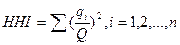 где Yi – размер фирмы (например, рыночная доля); k - количество фирм, для которых рассчитывается показатель. Индекс концентрации определяется как сумма рыночных долей крупнейших фирм, действующих на рынке. Индекс концентрации измеряет сумму долей крупнейших фирм на рынке. При этом, чем больше индекс концентрации, тем менее конкурентен рынок. Однако информация, которую дает индекс концентрации, далеко не достаточна для характеристики рынка. Показатель индекса концентрации не говорит о том, каков размер фирм, которые не попали в выборку k, а также об относительной величине фирм из выборки. С этой особенностью индекса концентрации связана возможная неточность при его использовании. 2. Индекс Херфиндаля-Хиршмана, который определяется как сумма квадратов долей всех фирм, действующих на рынке: