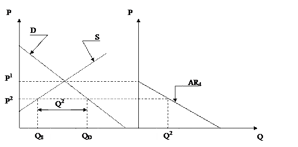 Рис. Анализ рынка с доминирующей фирмой В левой части рисунка представлен рынок всех фирм, кроме доминирующей, т.е. фирм-аутсайдеров. Предложение фирм аутсайдеров обозначено через S (суммарный выпуск всех фирм-аутсайдеров). Р1 – цена, по которой фирмы-аутсайдеры готовы предложить на рынок весь объем продукции, которую запрашивает покупатель по этой цене (равновесная цена). Если эта цена будет снижаться, то фирмы-аутсайдеры будут менее охотно предлагать свой товар. Чем ниже цена на продукцию, тем больше разница между предложением этих фирм QS и рыночным спросом QD. В случае если доминирующая фирма устанавливает цену на уровне Р1, то фирмы-аутсайдеры будут предлагать весь объем продукции, необходимый потребителям. Это видно в правой части рисунка, где представлен рынок доминирующей фирмы, - при цене Р1 объем предложения фирмы-лидера равен нулю. Если доминирующая фирма установит более низкую цену, например, Р2, то появится разрыв между предложением фирм-аутсайдеров и спросом продукции. Разрыв между ними представляет собой объем спроса для доминирующей фирмы. Следовательно, при цене Р2 разрыв между QS и QD – это объем спроса, не обеспечиваемый фирмами-аутсайдерами. Таким образом, объем спроса доминирующей фирмы при цене Р2 определяется как: