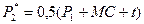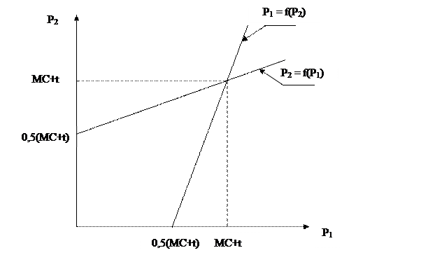 Рис. Функции ценовой реакции фирм в модели Хотеллинга Равновесными ценами являются цены Р1* = Р2*. Если приравнять правые части формул 8,9, то получим равновесные цены в модели Хотеллинга: