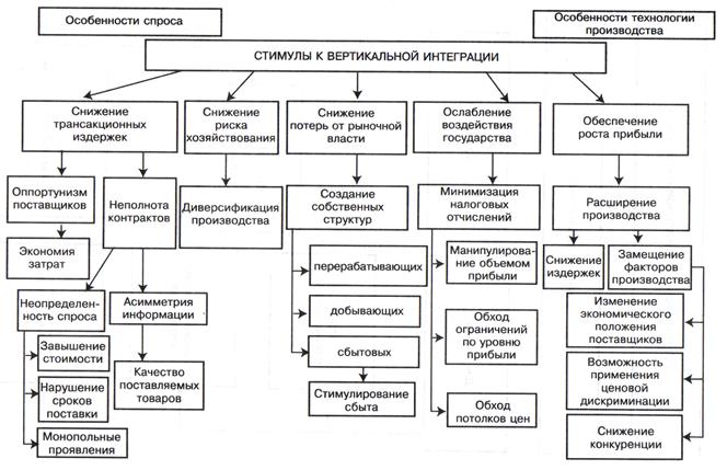 1. Недостатки и преимущества вертикальной интеграции. Вертикально интегрированной называется фирма, которая включает более одной стадии производства конечной продукции, т.е. от добычи сырья или производства материалов до изготовления конечной продукции. Вертикальные ограничения – это долгосрочные контракты, которые заключаются между неинтегрированной фирмой и поставщиками и покупателями, в которых оговариваются цены, условия поставки, условия реализации произведенной продукции, минимальные или максимальные цены перепродажи и т.д. Вертикальная интеграция и вертикальные ограничения являются формами ограничения конкуренции. Недостатками вертикальной интеграции является снижение эффективности: - для фирмы, к которым относят: 1) утрата специализации, т.е. известно, что разделение труда повышает его производительность. Отказ от разделения труда и специализации снижает эффективность производства и повышает издержки на единицу продукции, т.е. часто издержки производства дл фирмы оказываются выше, чем цена, по которой данный товар готовы купить; 2) усложнение процесса управления связано с ростом фирмы и с увеличением издержек на управление; 3) затраты объединения включают слияние или поглощение, которые являются формами вертикальной интеграции. Они связаны со значительным объемом расходов на совершение такого рода сделок; - для рынка: 1) повышение отраслевых барьеров связано невозможностью новым фирмам заключения контрактов с фирмами, включенными в вертикально интегрированную структуру; 2) рост рыночной власти подразумевает увеличение монопольной власти вертикально интегрированной фирмы. Стимулы и преимущества вертикальной интеграции рассмотрим в виде следующей схемы.