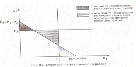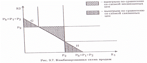 Целесообразность использования системы связанных продаж зависит от соотношения величин выигрышей и потерь выручки фирмы. Рассмотрим комбинированную схему продаж, когда товары можно купить и в наборе, и по отдельности. На рис. 9.7 видно, что эта схема обладает преимуществом и перед схемой независимых цен, и перед схемой связанных продаж. При этом при переходе от стратегии исключительно связанных продаж к комбинированной стратегии меняется ориентация части потребителей (на рисунке они отражены площадями G и Н). Эти покупатели приобретали бы наборы, ели бы фирма использовала стратегию исключительно связанных продаж, однако при возможности выбирать между покупкой только одного из товаров и покупкой набора эти покупатели выберут приобретение исключительно одного товара, т.к. для них чистый выигрыш от приобретения второго или первого товара превосходит чистый выигрыш от приобретения набора товаров:
