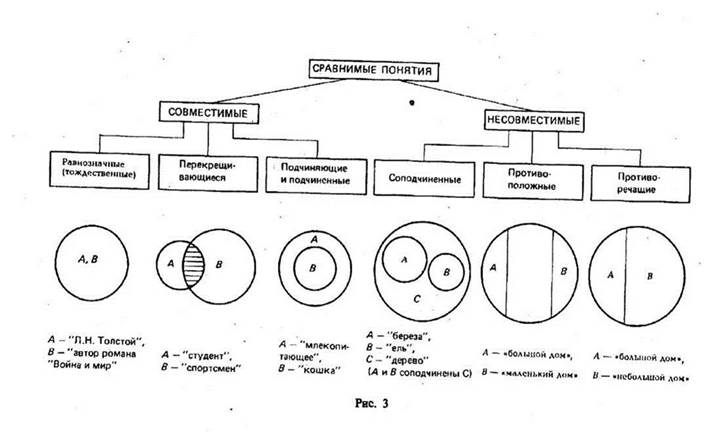 Сравнимые понятия делятся по объему на совместимые (объемы этих понятий совпадают полностью или частично) и несовместимые (объемы которых не совпадают ни в одном элементе). Типы совместимости: равнозначность (тождество), перекрещивание, подчинение (отношение рода и вида) Отношения между понятиями изображают с помощью круговых схем (кругов Эйлера3), где каждый круг обозначает объем понятия (рис. 3). Если понятие единичное, то оно также изображается кругом. Равнозначными (или тождественными) называются понятия, которые различаются по своему содержанию, но объемы которых совпадают, т. е. в них мыслится или одноэлементный класс, или один и тот же класс предметов, состоящий более чем из одного элемента. Примеры равнозначных понятий: 1) «река Волга»; «самая длинная река в Европе»; 2) «автор рассказа «Человек в футляре»; «автор комедии «Вишневый сад»; 3) «равносторонний прямоугольник»; «квадрат»; «равноугольный ромб». Объемы тождественных понятий изображаются кругами, полностью совпадающими. Понятия, объемы которых частично совпадают, т. е. содержат общие элементы, находятся в отношении перекрещивания. Примерами их являются следующие пары: «колхозник» и «ор-деноносец»; «школьник» и «филателист»; «спортсмен» и «студент». Они изображаются пересекающимися кругами (см. рис. 3). В заштрихованной части двух кругов мыслятся студенты, являющиеся спортсменами, или (что одно и то же) спортсмены, являющиеся студентами, в левой части круга А мыслятся студенты, не являющиеся спортсменами. В правой части круга В мыслятся спортсмены, которые не являются студентами. Отношение подчинения (субординации) характеризуется тем, что объем одного понятия целиком включается (входит) в объем другого понятия, но не исчерпывает его. Это отношение вида и рода; А — подчиняющее понятие («млекопитающее»), В — подчиненное понятие («кошка»).
