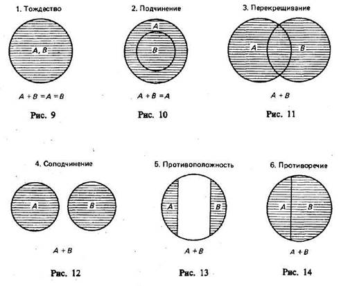Объединение (или сумма) двух классов — это класс тех элементов, которые принадлежат хотя бы к одному из этих двух классов17: Объединение обозначается: При выражении операции объединения классов пользуются обычно союзом «или» в не исключающем смысле. Например, говоря, что некто — член волейбольной или гимнастической секции, мы не исключаем того, что этот человек может быть одновременно членом обеих секций. В языке существует и такое употребление союза «или», при котором этот союз понимается в строго разделительном смысле,