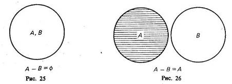 Рассмотрим два множества (класса) А и В, из которых В может и не быть частью А. Разностью множеств (классов) А и В называется множество тех элементов класса А, которые не являются элементами класса В. Разность обозначается А —В. Могут встретиться следующие пять случаев (если классы А и В не пусты и не универсальны). 1-й случай (рис. 23). Класс А включает в себя класс В. Тогда разностью А — В будет заштрихованная часть А, т. е. множество тех элементов, которые не суть В. Например, если мы из множества звуков русского языка (А) вычтем множество гласных звуков (В), то получим множество согласных звуков, изображенное на чертеже в виде заштрихованного кольца. 2-й случай (рис. 24). Разностью двух перекрещивающихся классов будет заштрихованная часть А. Например, разность множеств «рабочий» (А) и «рационализатор» (В) даст множество рабочих, которые не являются рационализаторами. 3-й случай (рис. 25). Если класс А полностью включен в класс В и класс В полностью включен в класс А, то эти классы (множества) равны (тождественны). Тогда разность А -В даст пустой, или нулевой, класс, т. е. класс, в котором нет ни одного элемента. Например, если мы из класса «сосна» вычтем класс «сосна», то разность А—В будет равна пустому классу. 4-й случай (рис. 26). Класс А и класс В не имеют общих элементов.