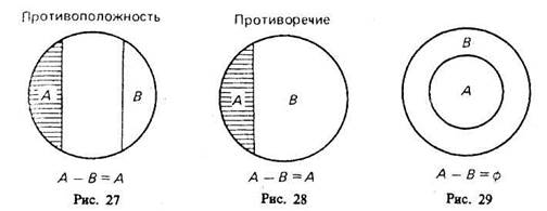 Тогда разность А—В=А, так как всякий элемент класса А не является элементом класса В. Например, разность класса «стол» (А) и класса «стул» (В) равна классу «стол» (А). В результате «вычитания» классов, соответствующих понятиям, находящимся в отношении противоположности [«низкий дом» (А), «высокий дом» (В)] или противоречия [«одушевленный предмет» (А), «неодушевленный предмет» (В)], разность А— В также равна А (рис. 27, 28).