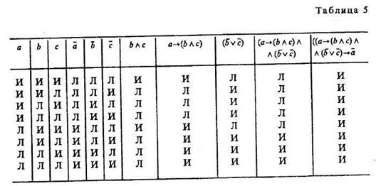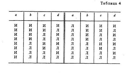 Буквы а, b, с — переменные, обозначающие суждения; буква «И» обозначает истину, а «Л» — ложь. Таблицу истинности для конъюнкции (а ^ b) можно разъяснить на следующем примере. Учителю дали короткую характеристику, состоящую из двух простых суждений: «Он является хорошим педагогом (а) и учится заочно (b)». Она будет истинна в том и только в том случае, если суждения а и b оба истинны. Это и отражено в первой строке. Если же а ложно или b ложно, либо и а, и b ложны, то вся конъюнкция обращается в ложь, т. е. учителю была дана ложная характеристика. Суждение: «Увеличение рентабельности достигается путем повышения производительности труда (а) или путем снижения себестоимости продукции (b)» — пример нестрогой дизъюнкции. Дизъюнкция называется нестрогой, если ее члены не исключают друг друга. Такое высказывание истинно в том случае, когда истинно хотя бы одно из двух суждений (первые три строки табл. 2), и ложно, когда оба суждения ложны. Члены строгой дизъюнкции Таблицу для импликации Эквиваленция в таблице Отрицание суждения Если в формулу входят три переменные, то таблица истинности для этой формулы, включающая все возможные комбинации истинности или ложности ее переменных в таблице, будет состоять из 23 = 8 строк; при четырех переменных в таблице будет 2* = 16 строк; при пяти переменных в таблице имеем 25 = 32 строки; при переменных — 2 n строк (табл. 4, 5). Алгоритм распределения значений И и Л для переменных (например, для четырех переменных а, b, с, d) таков (табл. 4).