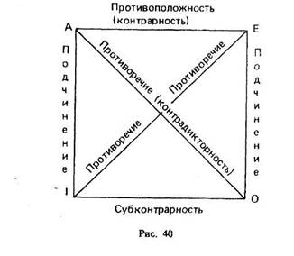 Суждения, как и понятия, делятся на сравнимые (имеют общий субъект или предикат) и несравнимые. Сравнимые суждения делятся на совместимые и несовместимые. В математической логике два высказывания р и q называются несовместимыми, если из истинности одного из них необходимо следует ложность другого (т. е. p и q никогда не могут оказаться одновременно истинными). «Это понятие легко распространить на любое число высказываний: высказывания р1 , р2 ,..., рn, называются несовместимыми, если не может оказаться, что все они являются одновременно истинными»12. Совместимые выражают одну и ту же мысль полностью или лишь в некоторой части. Отношения совместимости: эквивалентность, логическое подчинение, частичное совпадение (субконтрарность). Совместимые эквивалентные суждения выражают одну и ту же мысль в различной форме («Юрий Гагарин — первый космонавт» и «Юрий Гагарин первым полетел в космос»). Субъект здесь один и тот же, а предикаты различные по форме, но одинаковые по смыслу. В двух эквивалентных суждениях: «Михаил Шолохов — лауреат Нобелевской премии» и «Автор романа «Тихий Дон» — лауреат Нобелевской премии» — одинаковыми являются предикаты, а различными по форме выражения, но тождественными понятиями — субъекты. Если два высказывания эквивалентны, то невозможно, чтобы одно из них было истинным, а другое ложным. В сочинении, при заучивании материала, в устном изложении текста, при переводе с одного языка на другой — всюду учащиеся должны уметь кратко и корректно излагать свои мысли. А. П. Чехов дал такое сравнение: «Краткость — сестра таланта». Совместимые суждения, находящиеся в отношении логического подчинения, имеют общий предикат; понятия, выражающие субъекты двух таких суждений, также находятся в отношении логического подчинения. Отношения между суждениями по истинности принято схематически изображать в виде «Логического квадрата» (рис. 40).