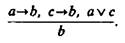 Выразим суждение «А есть В» переменной а, суждение «С есть D» — переменной b, суждение «Е есть F» — переменной с. Тогда схема простой конструктивной дилеммы выразится в виде следующего правила вывода: