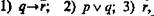 4) произвести все «поглощения» на основании законов поглощения: 5) из всех повторяющихся членов оставить только один (на основании законов идемпотентности). В результате получится силлогистический многочлен, который будет содержать все простые следствия из данных посылок, и только простые следствия. Они интереснее, чем обычные логические следствия, так как зависят от меньшего числа параметров (элементарных высказываний). Покажем это на конкретной задаче. Из данных трех посылок, имеющих следующие формы: 1. Соединяем посылки знаками конъюнкции и приводим выражение к КНФ: