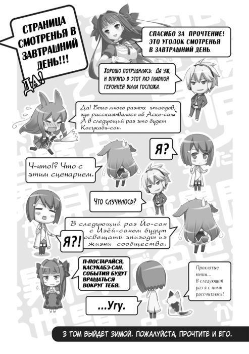 Давно не виделись. Спасибо за прочтение этой фантазии из другого мира, наполненной искренностью «Проблемные дети приходят из другого мира, верно? Ох, боже мой, объявление войны Демонического лорда?», сокращенно «Проблемные дети». Хорошо, по поводу работы «Проблемных детей»… В этой книге содержится гораздо больше элементов повествования нежели в предыдущей из-за чего она даже не вписалась в ограничение по страницам, благодаря этому даже на послесловие было отведено целых восемь страниц [4]! Поверить не могу, что же такое произошло, чтобы писать послесловие на восемь страниц? Другими словами, оно увеличилось вдвое! Возмутительно! Это заговор? Инопланетяне? Путешественники во времени? Или сверхлюди? Я думаю, это должен быть кто-то из другого мира.Непременно. Последний том Харухи Судзумии был очень интересным! Но… не достоин того, чтобы получить восьмистраничную специальную колонку, дурак! …Нет, поскольку я не смог уместить повествование в заданное издательством количество страниц, это моя вина И я снова выделю немножко места, чтобы извиниться перед Y-сан.