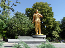 Вы там, в Донецке начудили с бронзой – все суета... сам памятник себе в открытых душах...» Памятник Иосифу Кобзону именитому земляку (и, слава Богу, здравствующему) перед ДМ «Юность» появился в Донецке сравнительно недавно. Вроде бы и не уродлив, но, как по мне, без души сделан. Изначально по замыслу известнейших московских скульпторов, фигура Иосифа Давыдовича должна была быть установлена на музыкальном диске. В композицию также должен быть включен музыкальный фон. Идея установки памятника в Донецке была инициирована «Землячеством донбассовцев в Москве». На собрании учредители Фонда «Золотой Скиф» поддержали эту инициативу. После того, как эта идея была согласована с Президентом Фонда Виктором Януковичем, начались переговоры с самим Кобзоном, который вначале наотрез отказался давать разрешение на установку памятника. Он все повторял: «Что вы меня хороните раньше времени!». Но скульптор Рукавишников изложил свою мотивацию создания памятника – приурочить его установку событиям, по захвату заложников во время мюзикла «Норд-Ост» на Дубровке в Москве, когда Кобзон пошел на переговоры с террористами и спас жизнь пятерым заложникам, среди которых было трое маленьких детей. По первоначальной задумке монумент должен был состоять из двух частей: рыцарские доспехи, сквозь которые пробиваются весенние тюльпаны и шагающая фигура Кобзона на этом фоне. Эта идея понравилась Кобзону, и скульптор уже было приступил к ее воплощению, как тут тогдашний градоначальник Анатолий Близнюк на собрании учредителей Фонда «Золотой Скиф», потребовал прекратить финансирование проектов Фонда. После того, как это стало известно Януковичу, в Москву полетело гарантийное письмо Рукавишникову с просьбой завершить работу над монументом – его нужно было срочно установить ко дню Донецка, к 30 августа. Но деньги были выделены только на скульптурное изображение Кобзона – типа, на доспехи потом дошлем средства. Похоже, об этом обещании все забыли – так и остался Иосиф Давыдович вне задуманной композиции, один одинешенек и, наверняка, мало радует своим существованием поющий прототип. Главная у Бубки мечта – высота, высота… Памятник Сергею Бубке, нашему современнику, правда, прославившемуся не на творческом, а на спортивном поприще, установлен в Киевском районе возле спортивного комплекса «Олимпийский». Сергей Назарович, ныне член Международного олимпийского комитета, изображен с основным спортивным снаряжением – шестом, который позволил ему стать тридцатипятикратным рекордсменом мира, шестикратным чемпион мира, чемпионом Олимпийских игр и даже почётным гражданином Донецка. Бронзовая скульптура не представляет собой какую-то архитектурно-художественную ценность – уникально в ней то, что постамент, на котором утановлена скульптура спортсмена во весь рост, высотой ровно 6 метров 15 сантиметров – именно на такую рекордную высоту прыгал Сергей Бубка. У памятника Сергею Бубке есть одна интересная деталь – птицы на ногах у прыгуна как знак того, что олимпийский чемпион взял невиданную высоту, преодолеть которую пока никто не решился. Анатолий Солов’яненко - «шахтарський герцог» Следующий донецкий памятник уникален тем, что попал в список самых аляповатых монументов независимой Украины из-за своей излишней пафосной и сомнительной художественной ценн