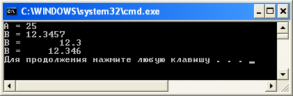 При работе с консольными приложениями существуют два основных способа ввода-вывода данных. Первый способ – это использование функций printf() и scanf(), унаследованных из языка С. Второй – использование объектов cin и cout языка С++. В одной программе не рекомендуют смешивать эти способы. Мы будем использовать второй способ. Примеры использования функций без труда можно найти в литературе по С++. Чтобы объекты cin и cout были доступны, как уже говорилось, нужно подключить к вашей программе заголовочный файл iostream. Объект cout используется для вывода в окно консоли. Ему с помощью операции << (операции помещения в поток) передается то, что мы хотим вывести на экран. Это могут быть переменные любых стандартных типов, литералы, выражения. Например, символьный литерал – это последовательность любых символов, заключенная в кавычки. Для вывода нескольких элементов используется цепочка операций <<. В зависимости от типа данные из внутреннего представления преобразуются в текстовую строку, которая и выводится на экран. В цепочку можно также помещать специальные функции, которые называются манипуляторами, для форматирования данных. При использовании манипуляторов с параметрами необходимо подключить к программе заголовочный файл iomanip. Некоторые полезные манипуляторы: endl – включает в поток символ новой строки и выгружает буфер, используется для перехода на новую строку; setw(int) – устанавливает максимальную ширину поля вывода для следующего значения; setprecision(int) – устанавливает максимальное количество цифр в дробной части или общее количество значащих цифр для чисел в зависимости от формата; fixed – устанавливает формат числа «с фиксированной точкой»; scientific – устанавливает формат числа «научный»; left, right –выравнивание текста; setiosflags (long) – устанавливает флаги состояния потока; resetiosflags(long) – сбрасывает флаги состояния потока. Ниже перечислены флаги форматирования, которые чаще всего используются: ios::left – выравнивание по левому краю; ios::right – выравнивание по правому краю; ios::fixed – печатать вещественные числа в форме с фиксированной точкой; ios::scientific – печатать вещественные числа в форме мантиссы с порядком; ios::showpoint – при выводе вещественных чисел печатать десятичную точку и дробную часть. Пример 1.3. Вывод чисел с использованием манипуляторов