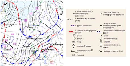 С их помощью определяют погоду. Рассмотрите карту и условные обозначения.