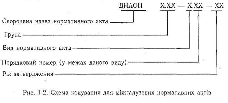 Государственные нормативные акты об охране труда (ДНАОП (укр) – ГНАОТ (рус) - это правила, стандарты, нормы, положения, инструкции и другие документы, которым представлена сила правовых норм, обязательных для исполнения. Законодательством предусмотрено, что в зависимости от сферы действия ДНАОП могут быть межотраслевыми или отраслевыми. Государственный межотраслевой нормативный акт об охране труда - ДНАОП общегосударственного пользования, действие которого распространяется на все предприятия, учреждения, организации народного хозяйства Украины независимо от их ведомственной (отраслевой) принадлежности и форм собственности. Государственный отраслевой нормативный акт об охране труда - ДНАОП, действие которого распространяется на предприятия, учреждения и организации независимо от форм собственности, относящихся к определенной отрасли. С целью машинной обработки государственные нормативные акты об охране труда должны кодироваться согласно структурных схем, приведенных на рис. 1.2 и 1.3. Группа для межотраслевых нормативных актов имеет цифровое обозначение в зависимости от государственных органов, которые их утвердили. Например, 0.00 - Госнадзорохрантруда, 0.03 - Министерство здравоохранения, 0.06 - Госстандарт. Группа для отраслевых нормативных актов имеет цифровое обозначение в соответствии с классификатором, составленного на основе «Общего классификатора отраслей народного хозяйства» Минстата Украины. Например, 1.1.10 - электроэнергетика, 1.3.10 - химическая промышленность, 2.1.20 - животноводство и птицеводство, 5.1.11 - железнодорожный транспорт, 7.1.30 - общественное питание и т. д.