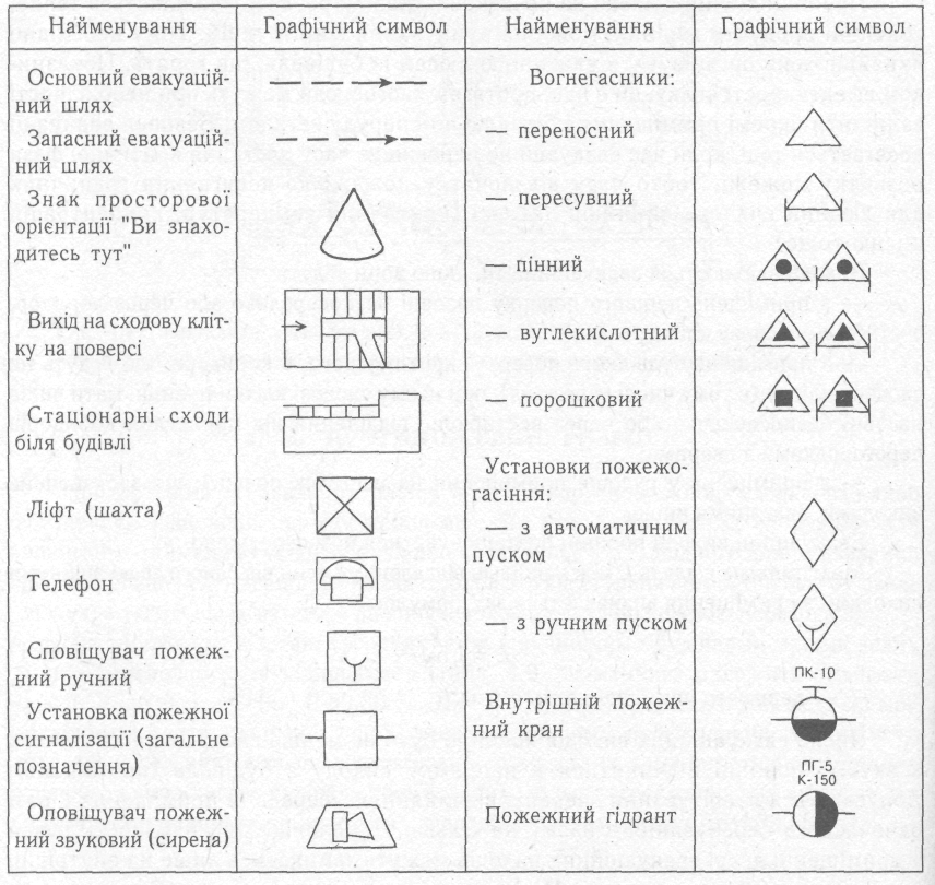 При возникновении пожара на начальной стадии ее развития выделяется тепло, токсичные продукты горения, возможные разрушения конструкций. Поэтому необходимо как можно быстрее организовать эвакуацию людей из зданий, горят. Показателем эффективности эвакуации есть время, в течение которого люди могут при необходимости оставить отдельные помещения и здание или сооружение в целом. Безопасность эвакуации достигается тогда, когда время эвакуации не превышает времени наступления критической фазы развития пожара, т.е. время от начала пожара до достижения предельных для человека значений факторов пожара (критических температур, концентраций кислорода и т.д.). Выходы считаются эвакуационными, если они ведут: - Из помещений первого этажа наружу непосредственно или через коридор, вестибюль, лестничную клетку; - Из помещений любого этажа, кроме первого, в коридоры, ведущие на лестничную клетку (в том числе через холл), при этом лестничные клетки должны иметь выход наружу непосредственно или через вестибюль, отделенный от примыкающих коридоров перегородками с дверями; - Из помещений в соседнее помещение на том же этаже, обеспеченное выходами, указанными выше. Эвакуационные выходы должны располагаться рассредоточено. Максимальное расстояние L между наиболее удаленными друг от друга эвакуационными выходами из помещения определяется по формуле L = 1,5 (4.1) где Р - периметр помещения, м. Число эвакуационных выходов должно быть не менее двух. Двери на путях эвакуации должны открываться в направлении выхода из зданий (помещений). Допускается устройство дверей с закрытием внутрь помещения в случае одновременного пребывания в нем не более 15 человек. При наличии людей в помещении двери эвакуационных выходов могут запираться лишь на внутренние запоры, которые легко открываются. Минимальная ширина путей эвакуации - не менее 1 м, дверей - не менее 0,8 м. Расстояние от наиболее удаленной точки цеха или помещения до эвакуационного выхода определяется согласно СНиП 2.09.02-85 в зависимости от степени огнестойкости здания и количества эвакуируемых. Не допускается устраивать эвакуационные выходы через помещения категорий А и Б, а также через производственные помещения в зданиях ФИО, IV, IVa, V степеней огнестойкости. На видных местах здания и помещений (как правило, в коридорах и проходах, у выходов из помещений), вывешиваются планы эвакуации. Основные условные графические обозначения, которые могут использоваться в планах эвакуации приведены в табл. 4.11. Основні умовні графічні пожежні позначення