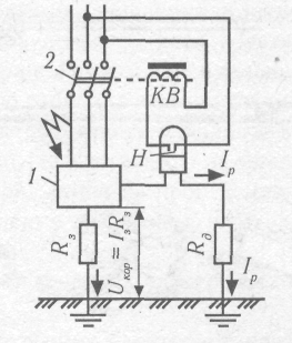 рис. 3.27 Схема электрическая зануления. Для уменьшения опасности поражения током, возникающая в результате обрыва нулевого провода, устраивают (многократно) дополнительное заземление нулевого провода Rд (рис. 3.27). Для того, чтобы произошло быстрое и надежное отключение, необходимо, чтобы ток короткого замыкания Ік.з превышал ток защитного аппарата Іап: Ік.з ≥ kІап, (3.27) где k - коэффициент кратности тока короткого замыкания относительно тока защ ного аппарата (k = 1,5 - для автоматических выключателей; k = 3,0 - для плавких предохранителей). Так, при занулении исключительно важное значение имеет правильный выбор предохранителей и автоматических выключателей в соответствии с величиной тока короткого замыкания петли фаза-ноль. При неправильном выборе плавкого предохранителя или автоматического выключателя, когда Ік.з <3Іав или Ік.з <1,5 Іав, может не состояться отключения установки, на корпус которой перешло напряжение, а затем будет существовать опасность для человека при его прикосновении к корпусу. Следует отметить, что одновременное заземление и зануление корпусов электроустановок значительно повышает их электробезопасность. Защитное отключение применяется как основное или дополнительное защитное средство, если безопасность не может быть обеспечена путем устройства заземления, или другими способами защиты. Защитное отключение - это быстродействующая защита, обеспечивающий автоматическое отключение электроустановки (не более чем за 0,2 с) при возникновении в ней опасности поражения током. Существует много схем защитного отключения. В качестве примера рассмотрим схему устройства защитного отключения, приведен на рис. 3.28. Такое устройство служит дополнительной защитой к заземлению и предназначено для устранения опасности поражения током при появлении на заземленном корпусе электроустановки повышенного напряжения. При повреждении изоляции и переходе напряжения фазы на корпус установки 1 сначала проявляется защитное свойство заземления, благодаря которой напряжение на корпусе снижается до некоторой величины Uкор =ІзRз. Если значение Uкор будет выше предельно допустимое напряжение Uкор.пр., то сработает устройство защитного отключения: реле максимального напряжения Н, замкнув контакты, подает питание на катушку отключения KB, которая размыкает контакты автоматического выключателя 2, при этом установка отсоединяется от электросети.