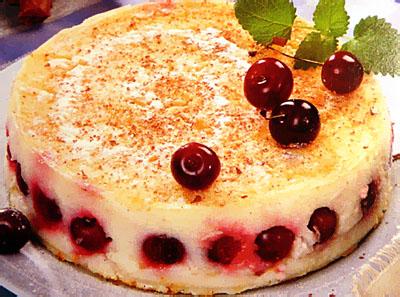 Манный пудинг с вишней. Ингредиенты: 75г масла, 125г сахара, тертая цедра 1 лимона, 3 яйца, 250г 9% творога, 150г сметаны, 150г манки, консервированная вишня без косточек. Приготовление: взбейте добела сахар, цедру и размягченное масло, добавьте в массу желтки, творог, сметану, манку, взбейте еще немного, введите взбитые в пену белки, осторожно перемешайте. Налейте в форму слой массы, сверху выложите вишни, сверху еще тонкий слой массы, снова выложите вишни, закройте массой, выпекайте 40 минут в горячей духовке. Остудите.