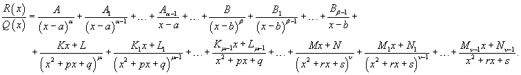 - Разложить знаменатель Q (x) на произведение одночленов и/или несократимых квадратичных выражений;