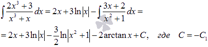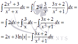 Задача нахождения неопределенного интеграла дробно рациональной функции сводится к интегрированию простейших дробей. Поэтому рекомендуем для начала ознакомиться с разделом теории разложение дроби на простейшие. Пример. Найти неопределенный интеграл Решение. Так как степень числителя подынтегральной функции равна степени знаменателя, то для начала выделяем целую часть, проводя деление столбиком многочлена на многочлен: Поэтому, Разложение полученной правильной рациональной дроби Полученный интеграл представляет собой интеграл простейшей дроби третьего типа. Забегая немного вперед, отметим, что взять его можно методом подведения под знак дифференциала. Так как Следовательно,