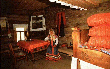 Russian peasant woman's head-dress ложки необыкновенно удобны: и черенок по руке, и не обожжёшься. Из дерева делали всё - и мебель, и корзину, и ступу, и сани, и колыбель для ребёнка. Часто эти бытовые предметы из дерева расписывали. Мастер думал не только о том, чтобы эти вещи были удобны, хорошо служили своему назначению, но заботился об их красоте, о том, чтобы они радовали людей, превращая работу, даже самую тяжёлую, в праздник. Особенно почитались у русского крестьянина прялки. Прядение и ткачество было одним из основных занятий русских женщин. Нужно было наткать ткани, чтобы одеть свою большую семью, украсить дом полотенцами, скатертями. Не случайно поэтому прялка была традиционным подарком у крестьян, они с любовью хранились и передавались по наследству. По старому обычаю парень, посватавшись к девушке, дарил ей прялку собственной работы. Чем прялка наряднее, чем искуснее вырезана и расписана, тем больше чести жениху. Долгими зимними вечерами собирались девушки на посиделки, приносили прялки, работали да хвастались жениховыми подарками. В каждой местности прялки украшались по-своему. Ярославские прялки стройные, высокие, силуэтом своим напоминают женскую фигуру в пышном сарафане* и кокошнике, украшает их обычно сквозная резьба. Вологодские прялки массивные, тяжёлые, сплошь покрыты строгим