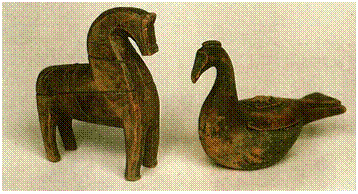 Так описывает А.С.Пушкин в поэме «Руслан и Людмила» картину тесного, замкнутого неторопливого быта Древней Руси. Ковшички для питья имели ладьевидную форму. Ручки ковшей делались в виде головы коня или утки. Ковши щедро украшались резьбой или росписью. Вокруг большого ковша, возвышавшегося в центре стола, они были похожи на утят вокруг наседки. Ковши, имеющие форму утки, так и назывались ковшй-утицы. Братины - точёные сосуды для напитков в виде шара - тоже расписывались, давались к ним и надписи, например такого содержания: «Господа, гостите, пьяными не напивайтесь, вечера не дожидайтесь!» Из дерева вырезали и красивые солонки в виде коней и птиц, и мйски, и, конечно, ложки. Деревянные ложки и в наши дни не стали музейными экспонатами. Мы охотно покупаем их для себя, дарим друзьям. Деревянные Деревянные солонки. Русский Север. XIX век.