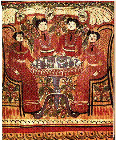 feasts buttercups городёцких мастеров служила сама их жизнь, праздничная её сторона, нарядные костюмы, представления о благополучии. Здесь сцены гуляний, свиданий, и чаепитий, и застолий. В это же время сложилась характерная форма растительного орнамента с городёцкими купавками фантастической раскраски и такими пышными, что кажется, что бутоны вот-вот раскроются. Ведущий сюжет росписи донец занимает его верхнюю половину. В центре этой композиции главная фигура или растительный мотив (фигуры людей, гирлянды цветов).