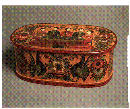 Ларец «Застолье». Л. Беспалова. «Городецкая роспись». На фабрике работают и опытные и совсем молодые мастера. Их работы продолжают удивлять весь мир древним и вечно молодым искусством, радовать своей непосредственностью. 1. 2. Какова роль петровских судостроительных верфей в развитии городёцкого промысла? Какой резьбой и росписью украшали корабли и дома городёцкие мастера? 3. Что значит утверждение о том, что «городёцкая резьба была тесно связана с живописью»? 4. Расскажите, что украшали городёцкие мастера своей резьбой и росписью, какие темы, какие мотивы они использовали. 5. Что собой представляют современные городёцкие изделия? 6. Почему, по вашему мнению, русский народ в наши дни, в конце XX века, продолжает с глубокой симпатией относиться к изделиям городёцкого промысла?