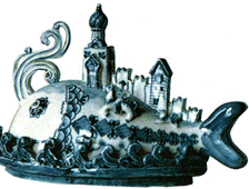 А вот как изобразила кита, который помог Ивану найти кольцо Царь-девйцы, художница из Гжели Л.Азарова. На хвосте сыр-бор шумит, На спине село стоит; Мужики на губе пашут, Между глаз мальчишки пляшут, А в дубраве меж усов Ищут девушки грибов.