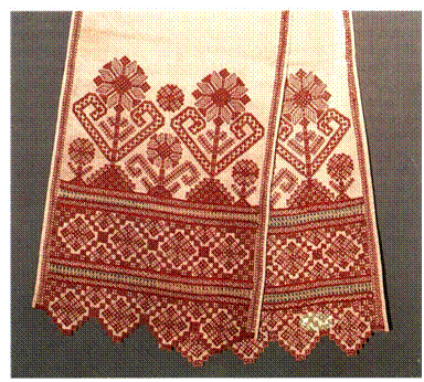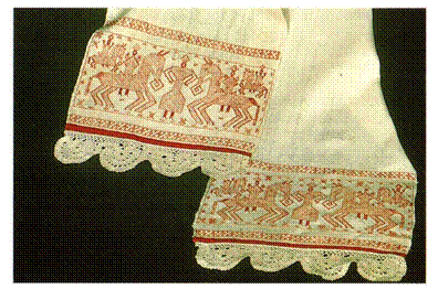Вы обращали внимание на то, как живописен русский национальный костюм, особенно женский? Белая или цветная рубаха с вышитыми плечами и рукавами, сарафан, фартук, а на голове расшитый кокошник* или лента. А как красочны мужские рубашки с вышивкой по вороту! Издавна на Руси одежду в основном изготовляли из домотканного льняного холста, реже - из шерсти. Холст ткали на примитивном станке. Украшали одежду вышивкой. Вышивка не только делала костюм красивее и богаче, но и имела другое назначение. По народному повёрию, она должна была приносить человеку счастье, оберегать его ото всякого зла и беды, сближать с окружающей природой. Поэтому узоры народных вышивок включали в себя знак Солнца в виде ромба, круга или ладьи с конской либо птичьей головой. Было здесь и изображение Матери сырой земли* в виде женской фигуры с протянутыми к Солнцу руками, и Древо жизни, и звери, и птицы, и люди. С раннего детства девочки учились вышивать. Это занятие было традиционным для русской женщины как в бедной, так и в богатой семье. Крестьянская девушка должна была готовить себе приданое: свадебный наряд, выходную одежду, постельное бельё, скатерти, полотенца, занавески и многое другое. Девушки из зажиточных и даже богатых семей вышиванием заполняли своё свободное время. Такая работа считалась самой подходящей для женщины. Любовное ласковое и очень уважительное отношение народа к труду вышивальщицы отразилось в стихах и