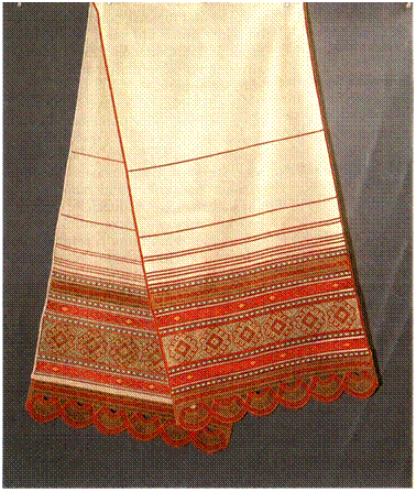 scalloped плотными частями узора. Когда такое кружево пришито к платью, оно как будто сливается с тканью и образует фестончатые или зубчатые края салфеток и скатертей, полотенец. Яркие, жизнерадостные цвета такой отделки сразу создают отличное настроение, радуют людей. Цветовая гамма Михайловского кружева всегда строится на контрасте красного с белым, остальные цвета, тоже достаточно яркие, насыщенные (синий или зелёный, чёрный, жёлтый), дополняют сочную окраску кружева и всего изделия в целом. После Отечественной войны оказалось, что кружевной промысел в городе Михайлове исчез и секреты его забыты. Многие мастерицы долгие годы восстанавливали лучшие образцы этого кружева, разрабатывали новые. Среди них была и Д. А. Смирнова, заслуженная художница РСФСР, о которой вы можете прочитать в рассказе «В поисках забытого мастерства». В 1925 году в городе Михайлове возникло небольшое предприятие, объединившее немногих кружевниц, а сегодня это современная фабрика «Труженица», изделия которой можно встретить по всему миру. Это яркие праздничные занавеси, подарочные полотенца, концы которых отделаны плотной вышивкой и в тон - Михайловскими кружевами. Это небольшие скатерти, салфетки, женские платья, детская одежда, выполненная в русском национальном стиле. И все вещи украшены богато, щедро, краски вышивки и кружев играют яркими, сочными тонами, но что самое важное - во всех Михайловских изделиях вы видите ту гармонию, которая присуща только подлинному искусству. 1. Как выглядят кружева из города Михайлова? Что значит выражение: «Кружево служит как бы продолжением вышивки»? 2. Расскажите, что вам известно о рязанском кружеве, о его особенностях.