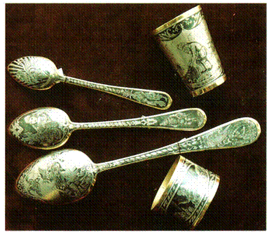 монстрйровать прочность великоустюжской черни. Он взял серебряную пластину, на которой был сделан черневой рисунок и стал молотком ударять по одной половине рисунка. Пластинка расплющилась, увеличилась вдвое, вместе с ней увеличился и рисунок, но ни одна крошка черни не отделилась от него. В начале XX века, когда в России началось бурное развитие промышленности, на рынках появились дешёвые изделия, изготовленные на машинах. Изделия промыслов не могли с ними конкурировать, так как стоили гораздо дороже. Стало невыгодно заниматься ручным трудом, и многие промыслы угасли. Именно тогда в Великом Устюге и соседних городах перестали производить финифть и филигрань, шитые золотом вещи и устюжские печные изразцы. Искусство северной черни испытало на себе всю тяжесть этого периода. Умирали старые мастера черневого дела и вместе с ним умирали вековые традиции. Молодые люди не хотели заниматься этим трудным и невыгодным делом. Промысел северной черни почти полностью угас: у