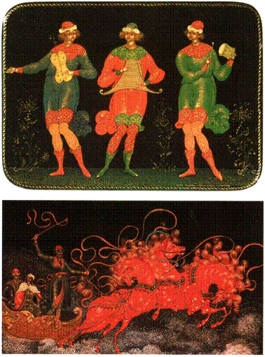 сохранить родовое мастерство, традиционные навыки ико-нописания, передававшиеся от отца к сыну, из рода в род? Голиков выбрал в качестве основы не традиционное дерево, а изделия из папьё-машё с чернолаковой поверхностью, которые с конца XVIII века расписывались в подмосковных сёлах. Ровная, отражающая свет лаковая поверхность выявляла декоративные качества палехского мастерства. Потомственный иконописец, специалист по «долйчно-му письму» (одежды), Голиков становится одним из родоначальников нового искусства Палеха - лаковой миниатюры. Старейший мастер Палеха Баканов вспоминал, как свободно, легко мог он развернуть мотивы хороводов* или битвы на маленькой, почти в вершок, круглой или прямоугольной коробочке. И. Голиков насыщает цвет многими оттенками, использует различные возможности формы, язык иносказания, сказочного вымысла, свой жизненный опыт и поэтическое чувство. Он мог написать снег красным, коней синими и зелёными. Связь с фольклорными традициями позволяла ему сохранить условность художественного обобщения. В палехской миниатюре природа изображается как бы в