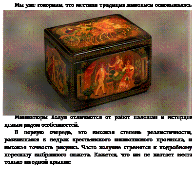 оно нашло достойное применение в росписи изделий из папьё-машё. Но путь к этому искусству был сложным и трудным. Многому художники научились у своих товарищей - палешан и мстёрцев, тоже переживших период поиска в новом для себя виде творчества. А это значит, что искусство миниатюры Холуя теснейшим образом связано не только с традициями древнерусской темперной живописи (иконописи), но и с развитием искусства миниатюры в Палехе и Мстёре. В 1934 году в Холуе была организована художественная артель, которая состояла из двадцати двух человек. Они, по примеру палешан, начали писать миниатюры на лаковых изделиях из папьё-машё. Среди миниатюристов Холуя было немало по-настоящему талантливых художников, создавших свою собственную школу, собственный стиль, стиль Холуя. Такими художниками были С.А.Мбкин, К.В.Костёрин, Д.М.Добрынин и В.Д.Пузанов-Мблев. Творчески осваивая опыт прошлого и настоящего, эти художники шли своим путём, отстаивая свою оригинальную манеру письма, свой индивидуальный почерк. В их работах нашли яркое отражение темы героических событий истории русского народа и современности, темы классической литературы и фольклора. На протяжении всей истории существования художественного промысла лаковой миниатюры Холуя местные художники вели упорные поиски в совершенствовании своего мастерства и стиля. В результате Холуй занял своё самостоятельное и почётное место в искусстве русской лаковой миниатюры. Уже в 1937 году художникам Холуя были присуждены бронзовые медали на Всемирной выставке в Париже. В 1939 году их работы демонстрировались на Всемирной выставке в Нью-Йорке. В 50-е-60-е годы ряды старых мастеров пополняются выпускниками Художественной профессионально-технической школы, организованной в 1943 году, в трудное военное время. Вместе с молодыми художниками в искусство Холуя приходит ещё большее разнообразие тем, сюжетов, новая манера исполнения и дальнейшее закрепление стилевых особенностей холуйской миниатюры.