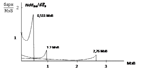 Рис. 3.8. Энергетическое распределение электронов отдачи для γ-квантов различных энергий Поскольку выше начальной энергии γ-квантов энергия электронов отдачи быть не может, после комптоновского пика распределение резко обрывается к нулю. При уменьшении энергии γ-квантов (менее 1,5 МэВ) равномерность распределения ниже комптоновского пика также нарушается. На рисунке 3.9 представлена зависимость энергии комптоновского края от энергии гамма-квантов. Из него следует, что с ростом энергии гамма-квантов различие в энергиях фотопика и комптоновского края сначала быстро растёт, но, начиная с энергий 100-200 кэВ это различие стремится к постоянной величине. Эффект образования пар происходит при прохождении γ-кванта вблизи ядра, если его энергия превышает пороговое значение 1,022 МэВ. Вне поля ядра γ-квант не может образовать пару электрон-позитрон, т.к. в этом случае будет нарушен закон сохранения импульса. Хотя энергии в 1,022 МэВ достаточно, чтобы породить пару, но тогда импульс порождённых частиц должен быть равен нулю, тогда как γ-квант имеет импульс отличный от нуля и равный E γ /c. Однако, в поле ядра этот эффект становится возможным, поскольку в этом случае энергия и импульс γ-кванта распределяются между электроном, позитроном и ядром без нарушения законов сохранения. При этом, поскольку масса ядра в тысячи раз превышает массу электрона и позитрона, то оно получает ничтожную часть энергии γ-кванта, которая практически полностью распределяется между электроном и позитроном. Схематично эффект рождения пары электрон-позитрон представлен на рисунке 3.10.