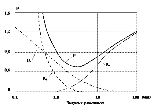 где Р1, Р2, …, Рn – весовое процентное содержание составляющих веществ в сложном веществе; μ1/ρ1 , μ2/ρ2 , …, μ n /ρ n – массовые коэффициенты ослабления составляющих веществ в сложном веществе. С учётом названных выше трёх основных эффектов взаимодействия гамма-излучения с веществом полный линейный коэффициент ослабления будет состоять из трёх составляющих, определяемых фотоэффектом, комптон-эффектом и эффектом порождения пар: