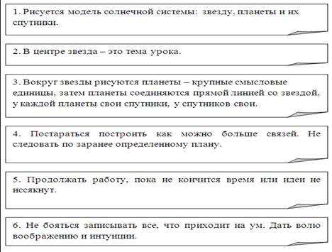 Очень важным моментом является презентация "новых" кластеров. Задача этой формы не только систематизация материала, но и установление причинно-следственных связей между элементами кластера. Например, как взаимосвязаны между собой смысловые блоки. Заданием может стать и укрупнение одного или нескольких элементов, выделение новых. В зависимости от цели урока учитель может организовать индивидуальную самостоятельную работу учащихся или коллективную – в виде общего совместного обсуждения. Предметная область не ограничена, использование кластеров возможно при изучении самых разнообразных тем. Правила составления кластеров: